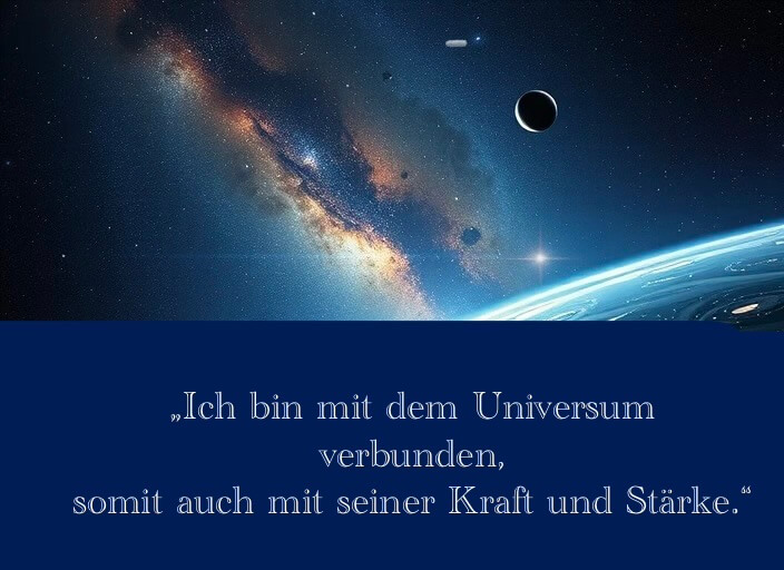 Bei jedem Atemzug spüre ich, wie die unendliche Weite des Universums durch mich hindurchfließt. Diese Verbindung schenkt mir Kraft, Mut und Stärke. Ich lasse Altes los, öffne mein Herz für göttliche Unterstützung und empfange die Möglichkeiten, die sich mir mit Leichtigkeit zeigen.
